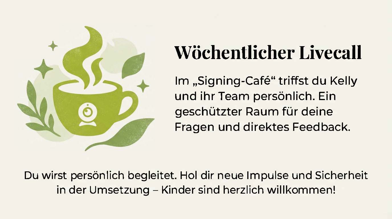 Du bist nicht allein: Im wöchentlichen Signing-Café erlebst du Kelly und ihr Team live und persönlich nahbar. In einem geschützten Raum bekommst du neue Impulse rund ums Singen, Spielen und Vorlesen – und Sicherheit in der Umsetzung. Du kannst Fragen stellen, erhältst direktes Feedback und wirst persönlich begleitet. Kinder sind herzlich willkommen.