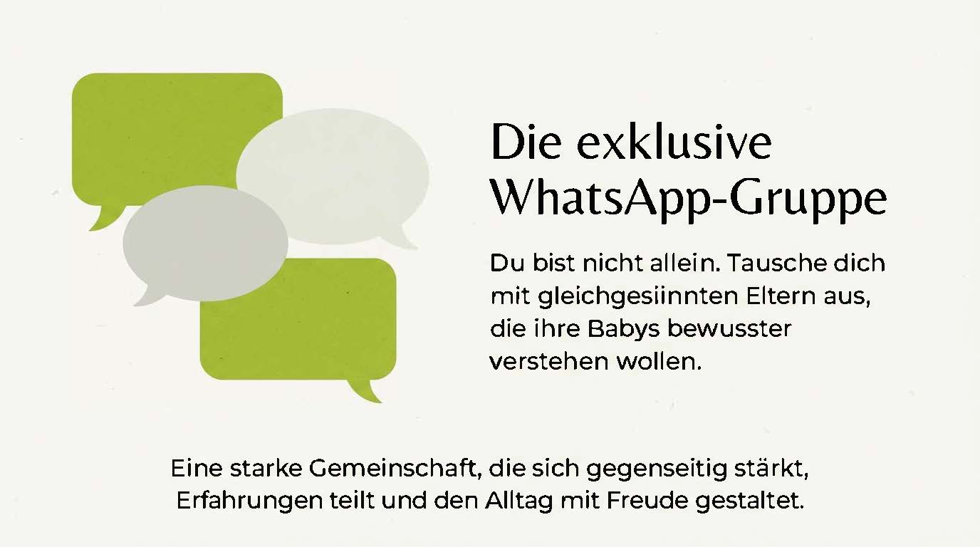 Elternschaft darf leicht sein – und gemeinsam gelingt sie noch besser. In unserer exklusiven, überregionalen WhatsApp-Gruppe findest du Austausch mit gleichgesinnten Eltern, die ihre Babys bewusster verstehen und den Alltag mit Freude gestalten möchten.