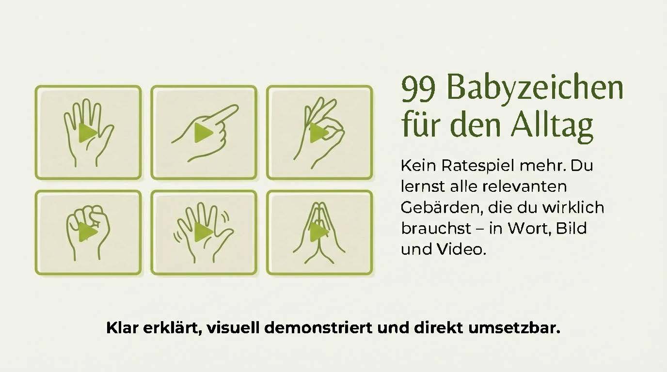 Du lernst die ersten alltagsrelevanten Babyzeichen Schritt für Schritt kennen – klar erklärt und sofort umsetzbar, ohne Überforderung.