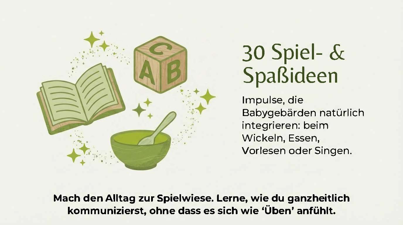 Du erhältst sofort anwendbare Impulse, die dir helfen, die Babygebärden natürlich in euren Alltag zu integrieren – beim Spielen, Essen, Wickeln, Vorlesen oder Singen.