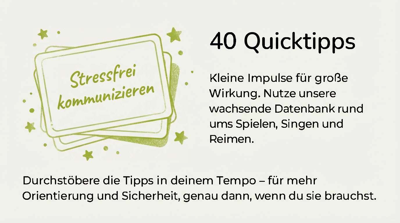 Kleine Tipps für den Alltag gefällig? Nutze unsere stetig wachsende Quick-Tipp-Datenbank rund ums Spielen, Singen, Reimen mit Babyzeichen für eine lebendige Interaktion im Alltag ohen Stress. Du kannst die Inhalte in deinem Tempo durchstöbern und dich bei Bedarf mit anderen darüber austauschen – für mehr Orientierung und Sicherheit im Alltag.